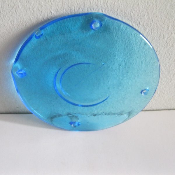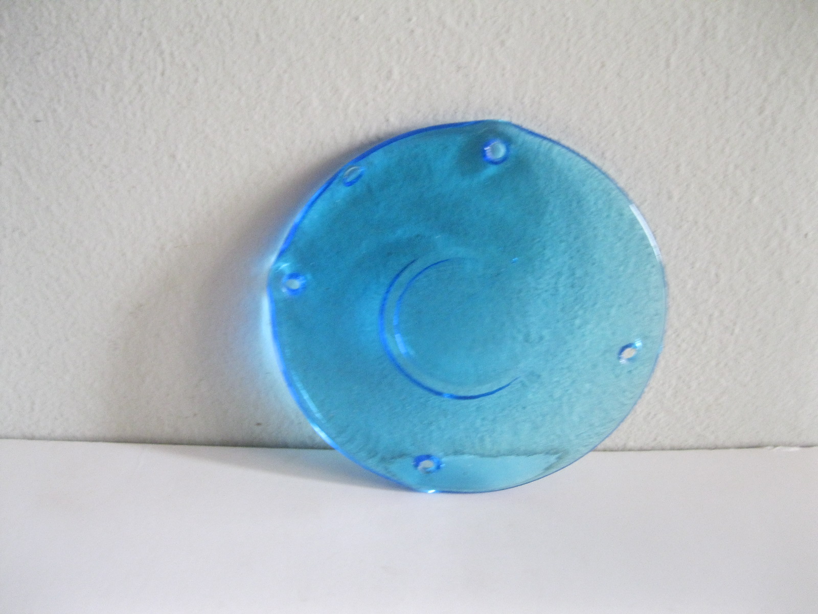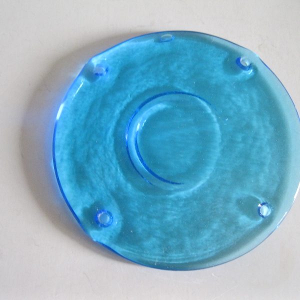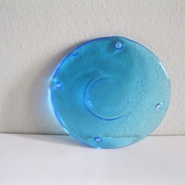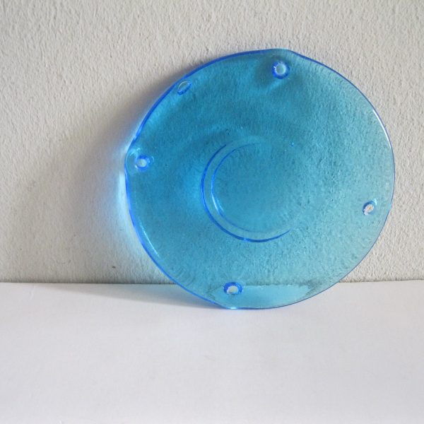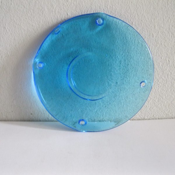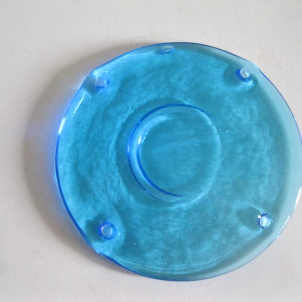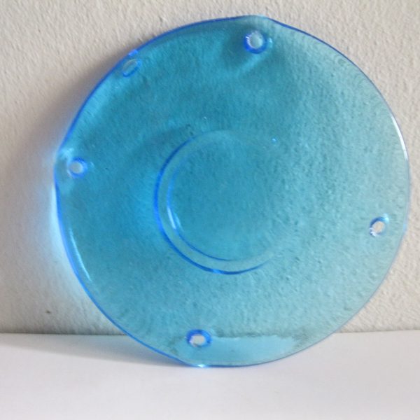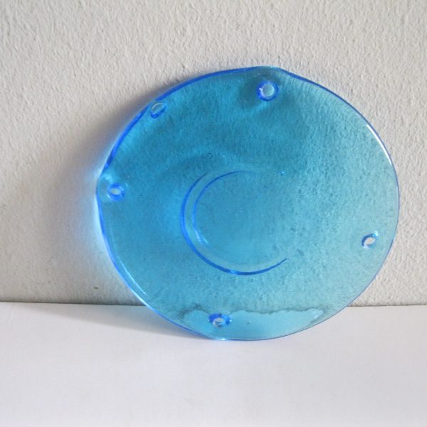Oryginalny, stary, piękny, szklany, niebieski medalion witrażowy/łapacz słońca huta Ząbkowice. Wykonany z przeźroczystego szkła w ślicznym niebieskim kolorze. Idealny np. do tworzenia abażuru lampy lub witraża w oknie. Posiada otwory umożliwiające jego zawieszenie Zachowany w stanie stanie bardzo dobrym, cały bez uszkodzeń . Polecam !