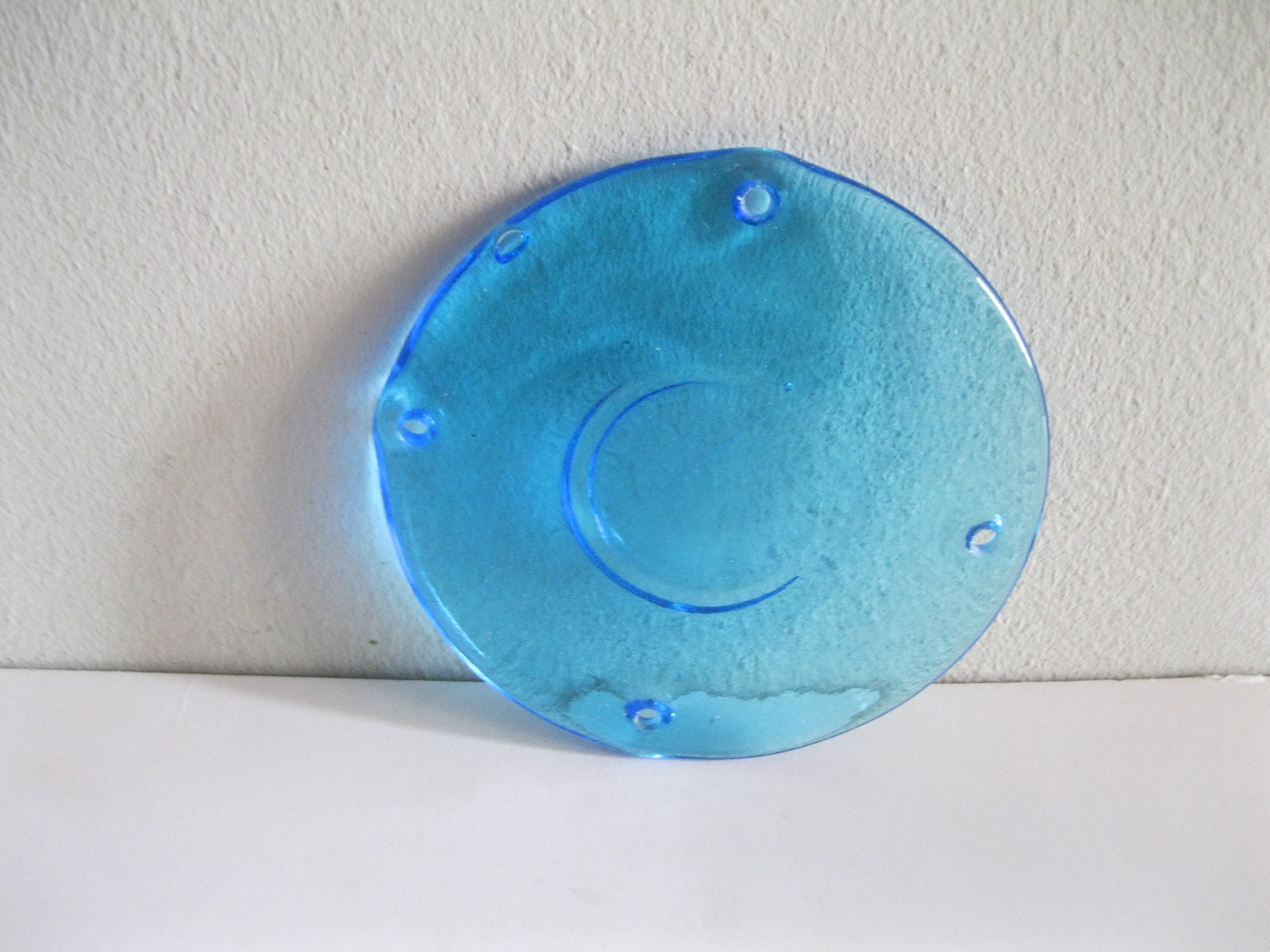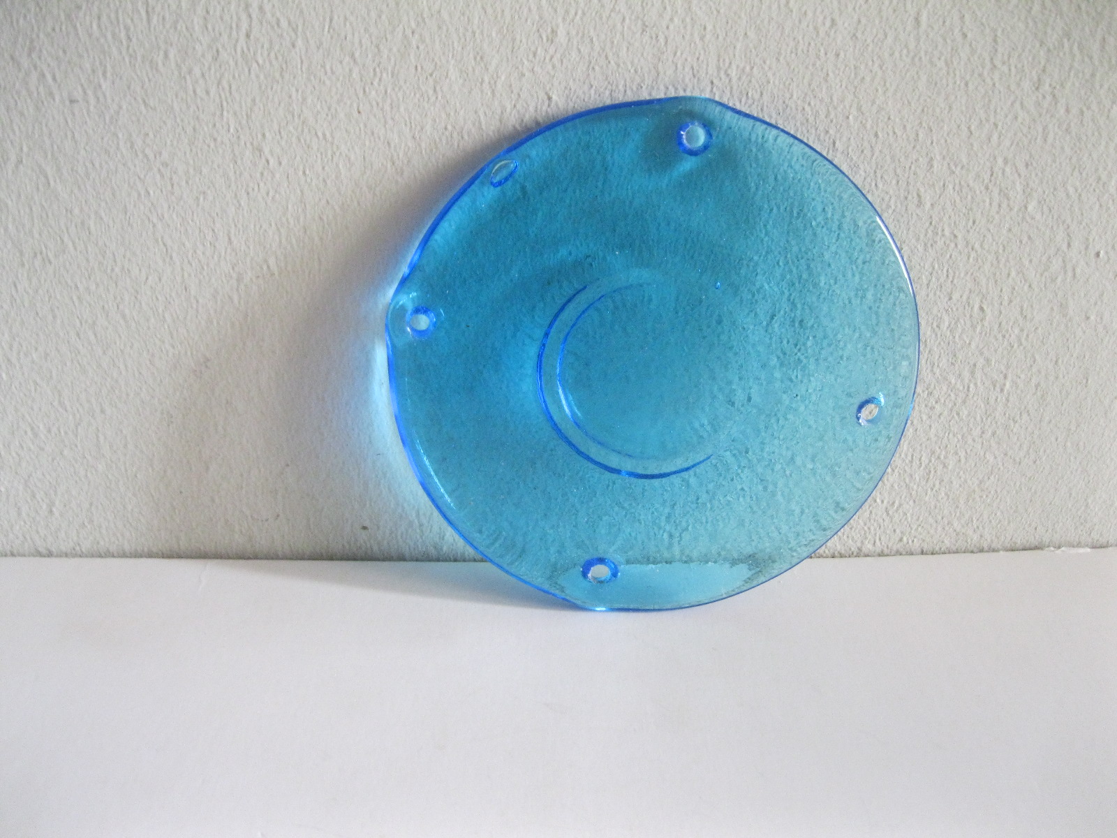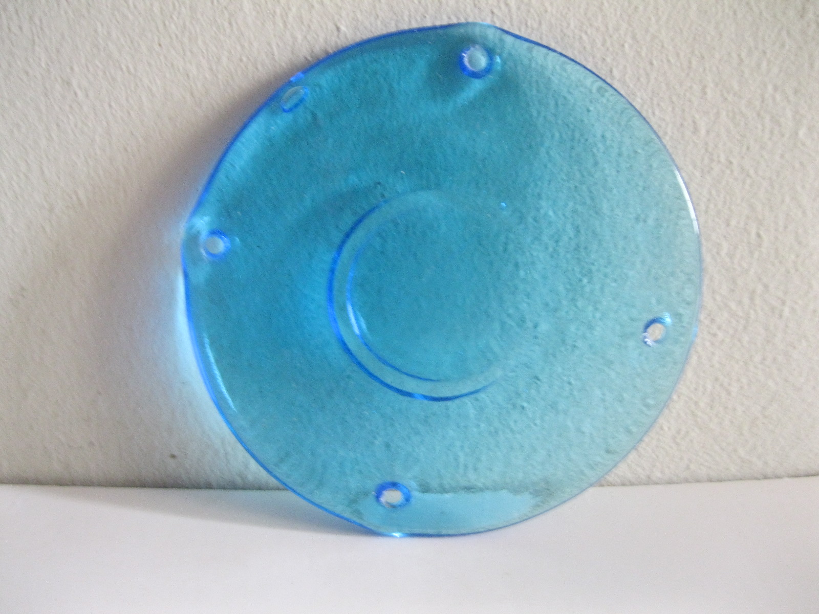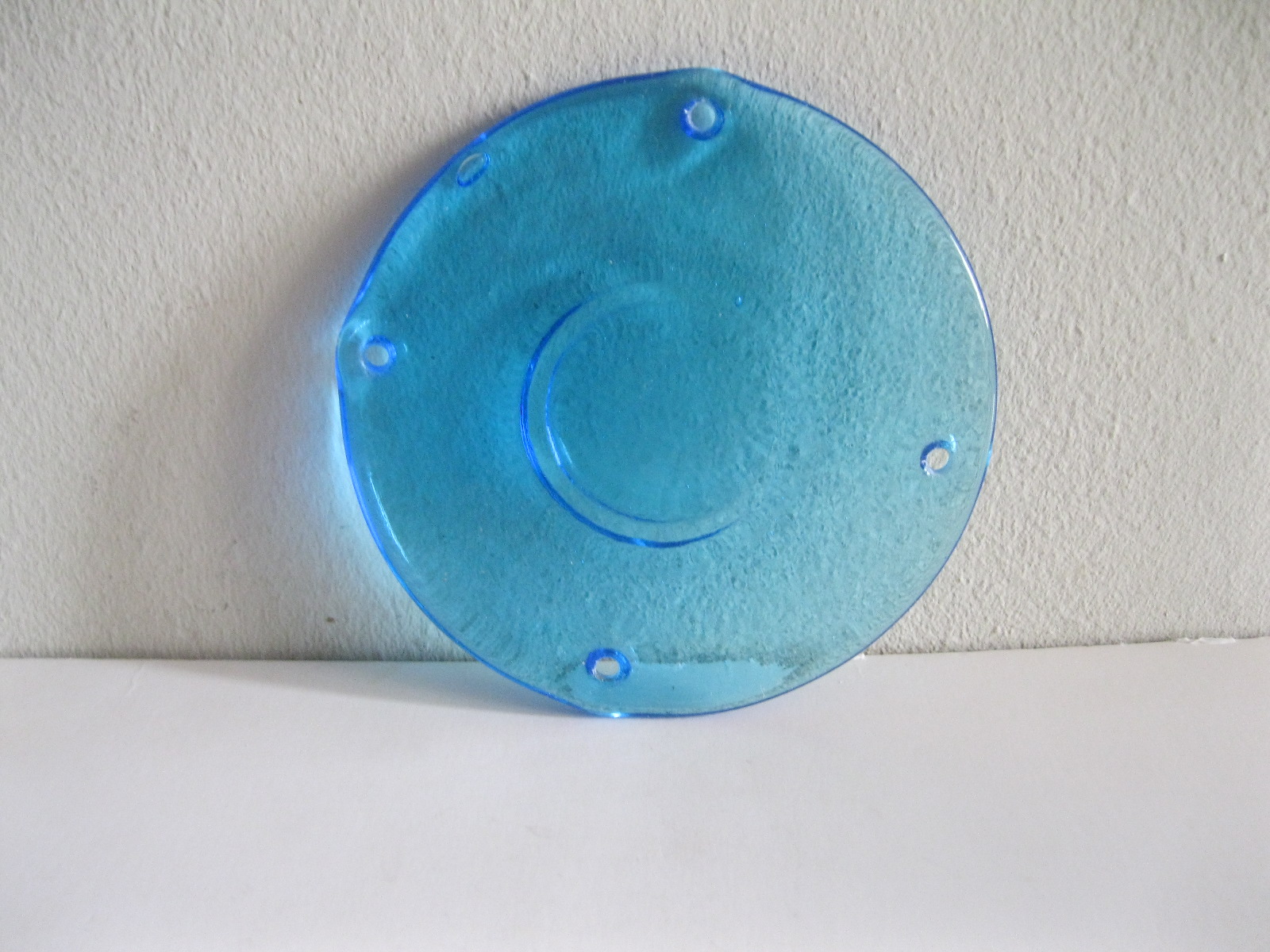 Oryginalny, stary, piękny, szklany, niebieski medalion witrażowy/łapacz słońca huta Ząbkowice. Wykonany z przeźroczystego szkła w ślicznym niebieskim kolorze. Idealny np. do tworzenia abażuru lampy lub witraża w oknie. Posiada otwory umożliwiające jego zawieszenie Zachowany w stanie stanie bardzo dobrym, cały bez uszkodzeń . Polecam !