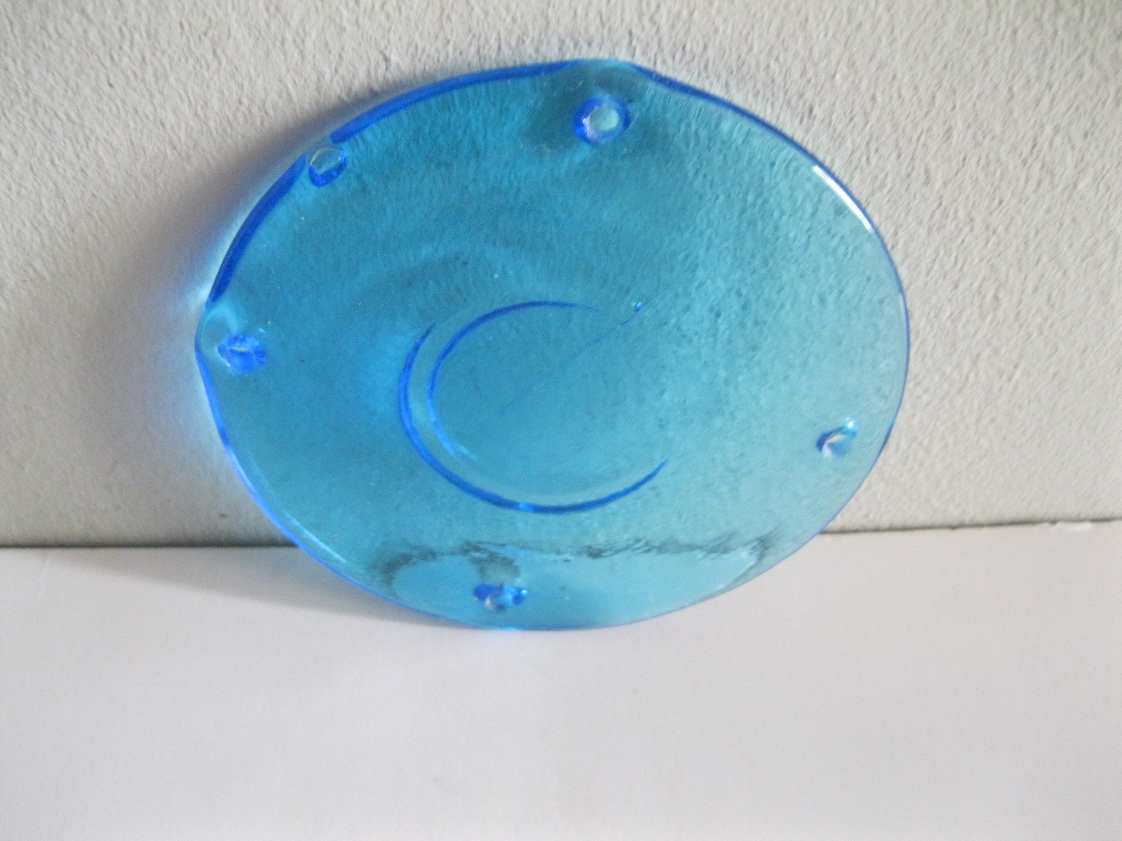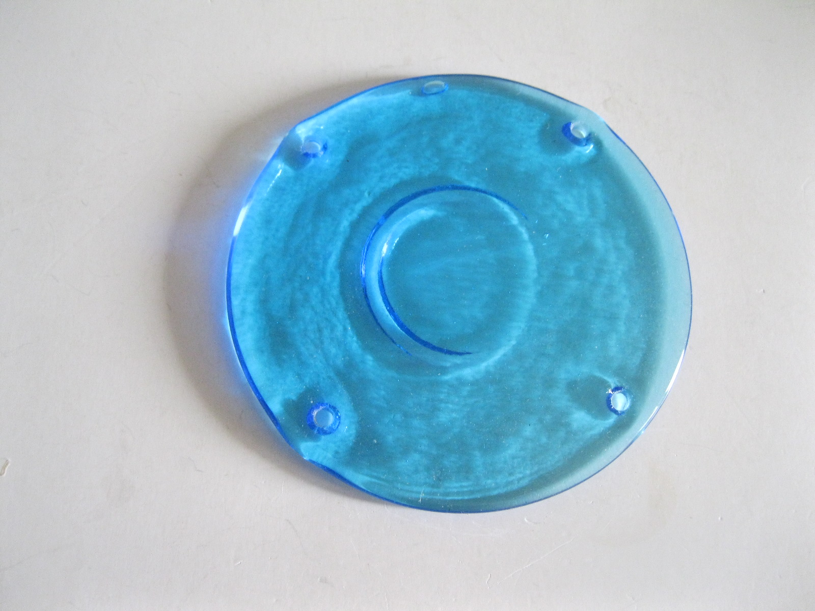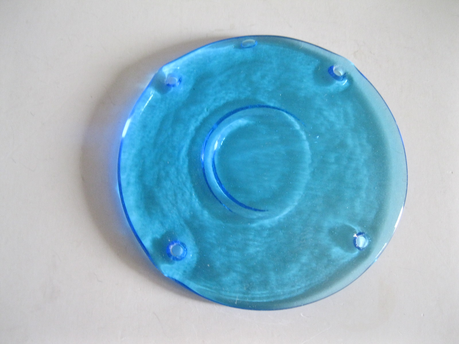 Oryginalny, stary, piękny, szklany, niebieski medalion witrażowy/łapacz słońca huta Ząbkowice. Wykonany z przeźroczystego szkła w ślicznym niebieskim kolorze. Idealny np. do tworzenia abażuru lampy lub witraża w oknie. Posiada otwory umożliwiające jego zawieszenie Zachowany w stanie stanie bardzo dobrym, cały bez uszkodzeń . Polecam !