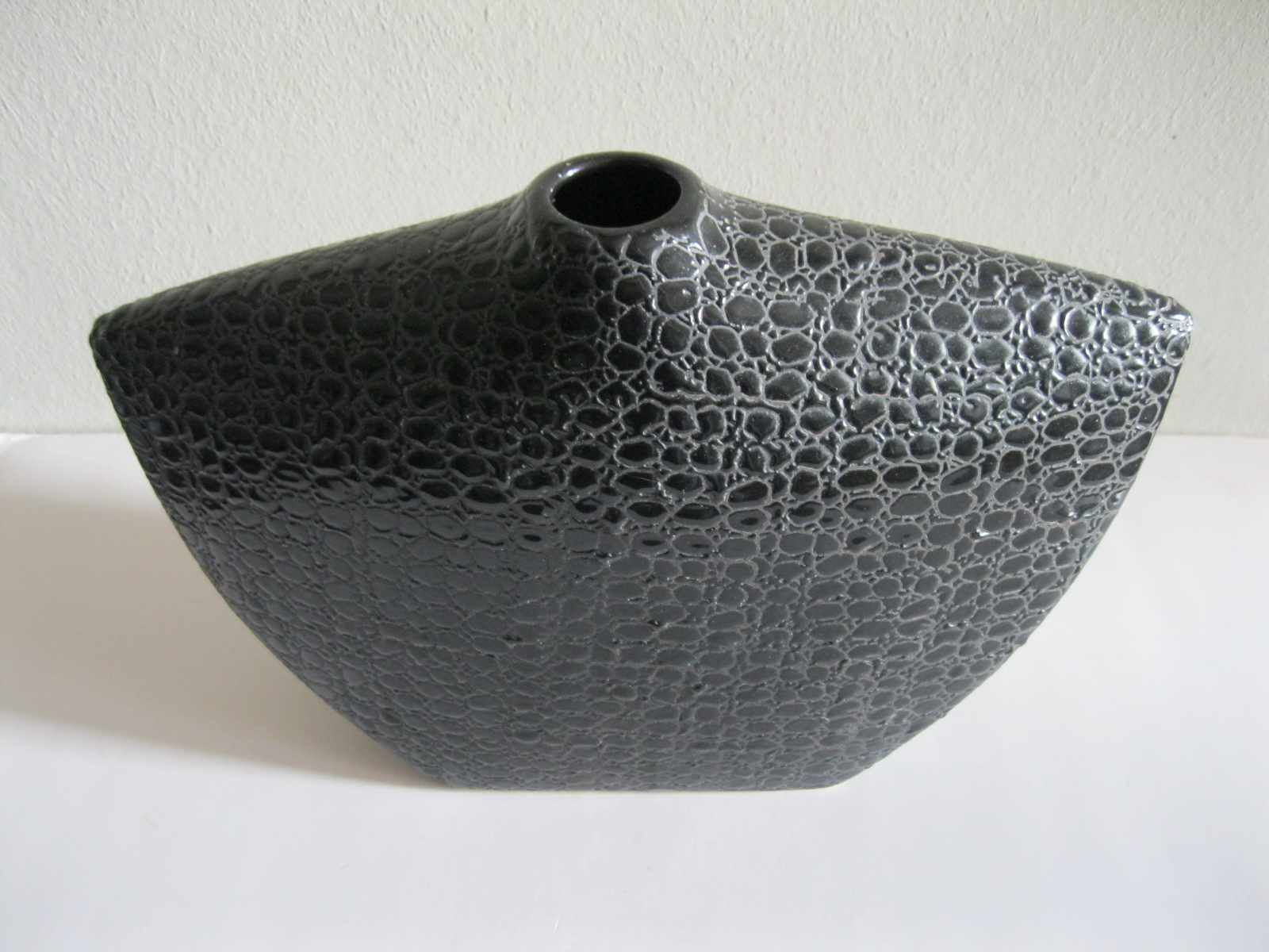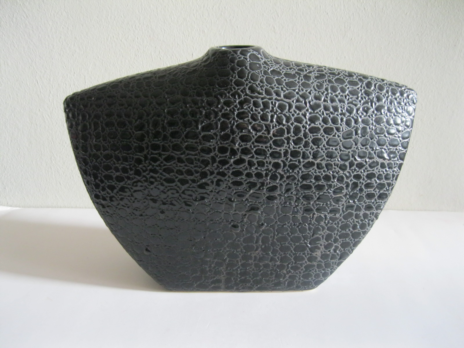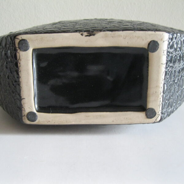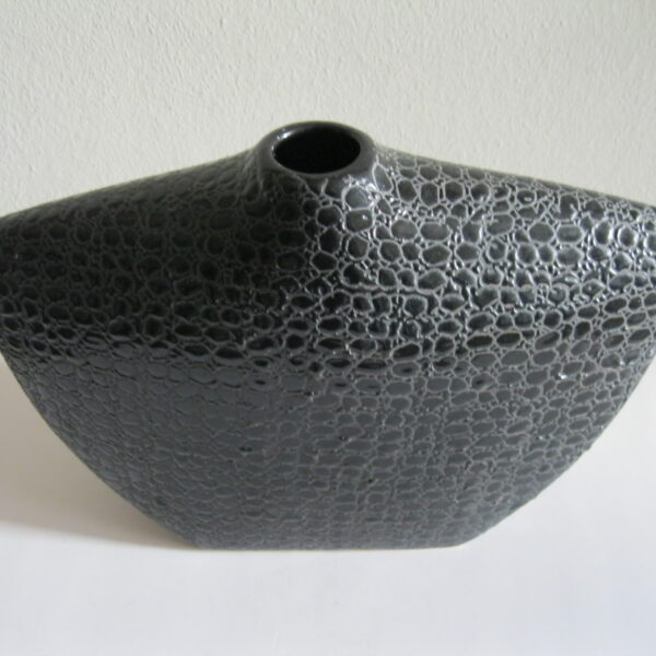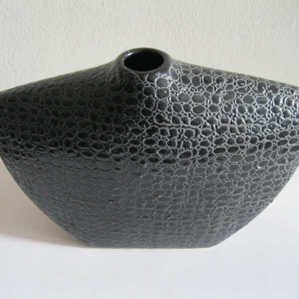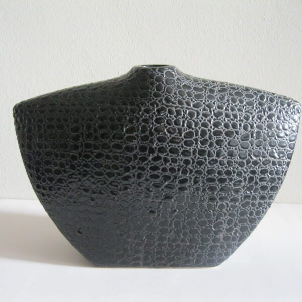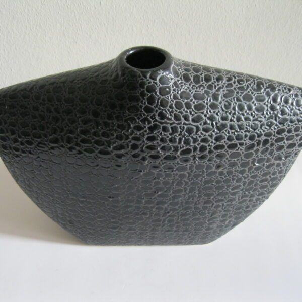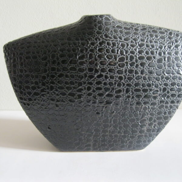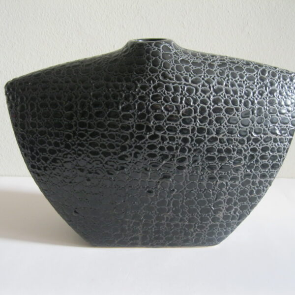 Oryginalny, stary, solidny, dość duży, ceramiczny, modernistyczny, płaski wazon na prostokątnej podstawie. Wykonany z ceramiki w czarnym kolorze, zdobiony na całości awangardowym tłoczeniem imitującym wężową skórę. Otwór wylewu wazonu nieduży, idealny na dwa, trzy kwiaty lub jeden kwiat. Bardzo dobrze szkliwiony. Bardzo dekoracyjny jako sam lub z kwiatem.. Zachowany w stanie bardzo dobrym, cały bez uszkodzeń. Niesygnowany.