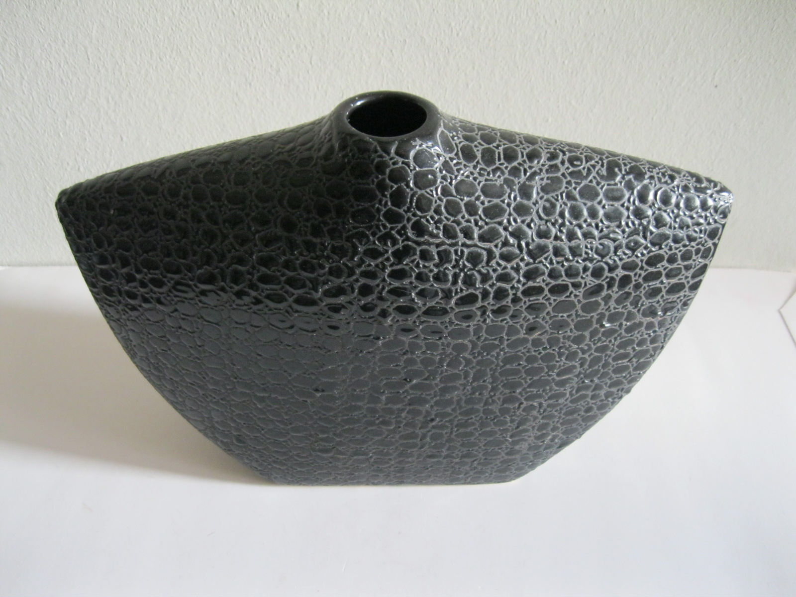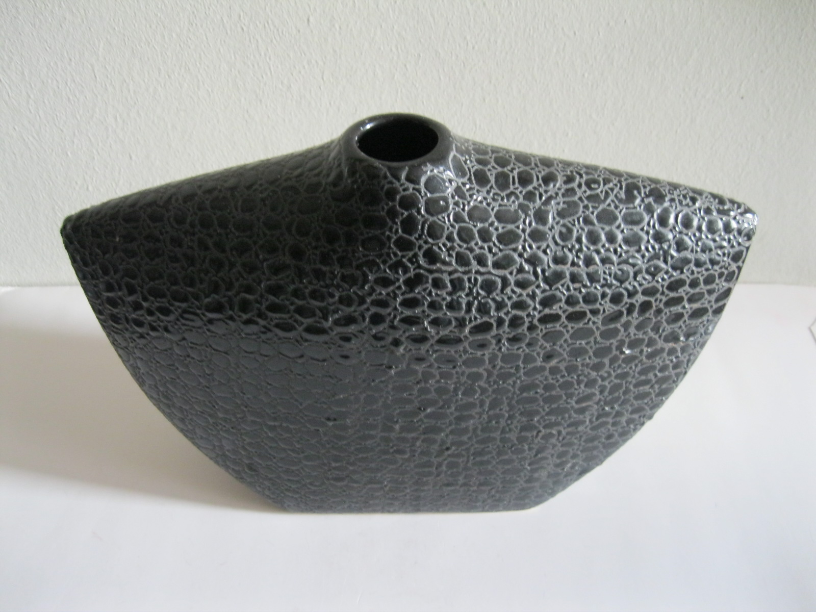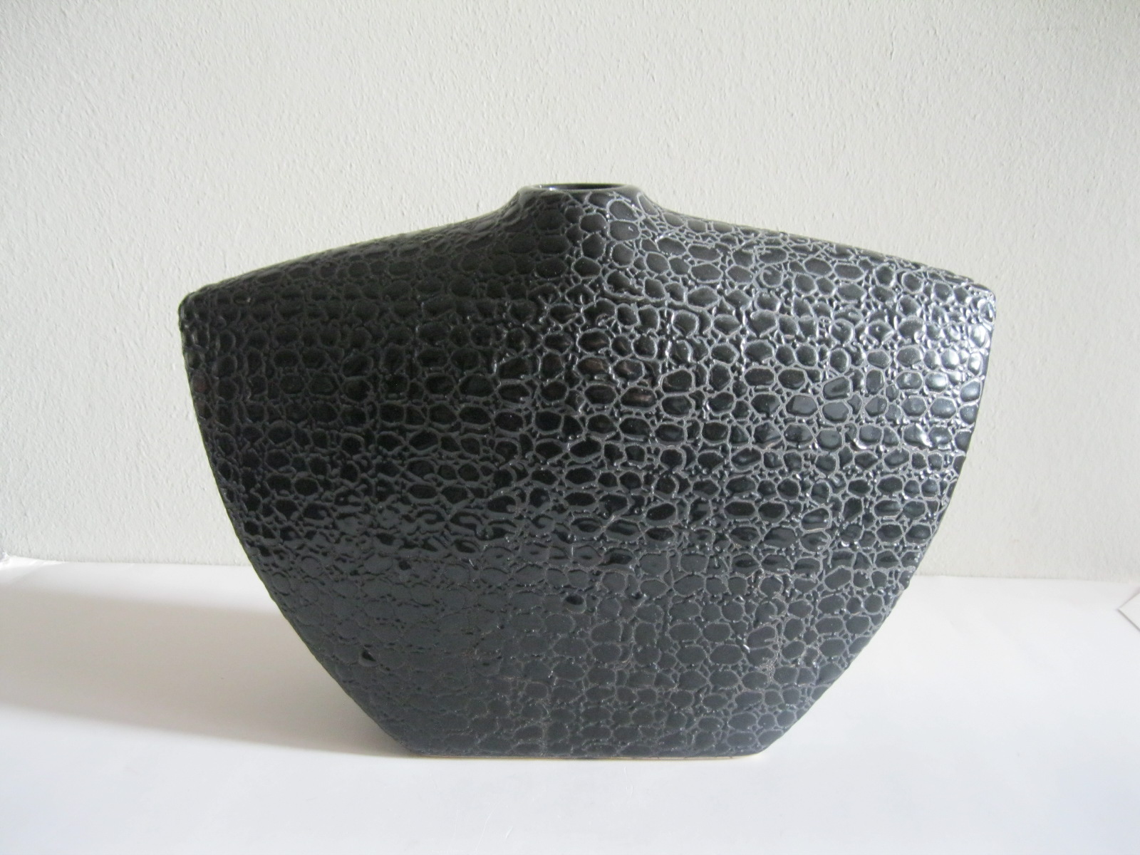 Oryginalny, stary, solidny, dość duży, ceramiczny, modernistyczny, płaski wazon na prostokątnej podstawie. Wykonany z ceramiki w czarnym kolorze, zdobiony na całości awangardowym tłoczeniem imitującym wężową skórę. Otwór wylewu wazonu nieduży, idealny na dwa, trzy kwiaty lub jeden kwiat. Bardzo dobrze szkliwiony. Bardzo dekoracyjny jako sam lub z kwiatem.. Zachowany w stanie bardzo dobrym, cały bez uszkodzeń. Niesygnowany.
