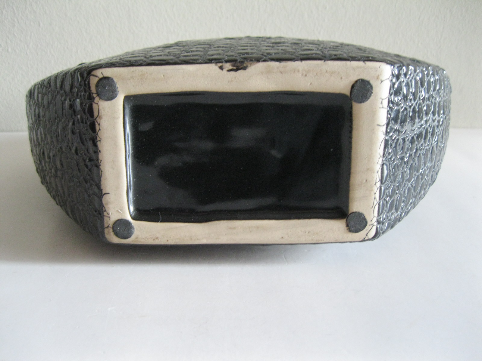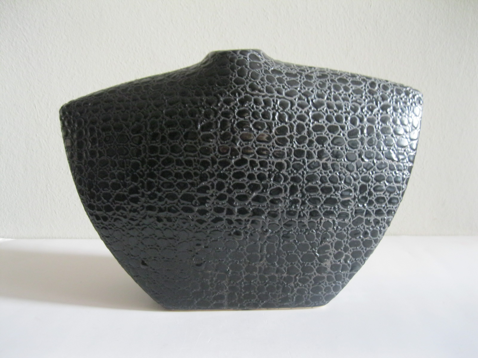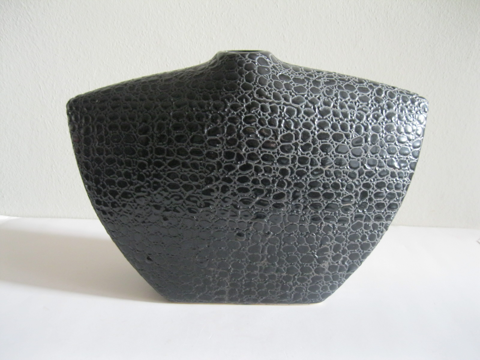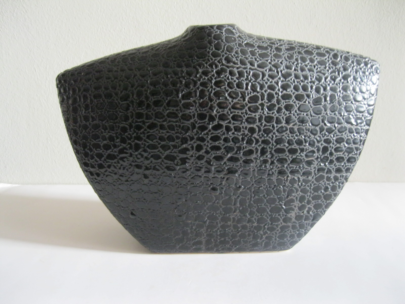 Oryginalny, stary, solidny, dość duży, ceramiczny, modernistyczny, płaski wazon na prostokątnej podstawie. Wykonany z ceramiki w czarnym kolorze, zdobiony na całości awangardowym tłoczeniem imitującym wężową skórę. Otwór wylewu wazonu nieduży, idealny na dwa, trzy kwiaty lub jeden kwiat. Bardzo dobrze szkliwiony. Bardzo dekoracyjny jako sam lub z kwiatem.. Zachowany w stanie bardzo dobrym, cały bez uszkodzeń. Niesygnowany.