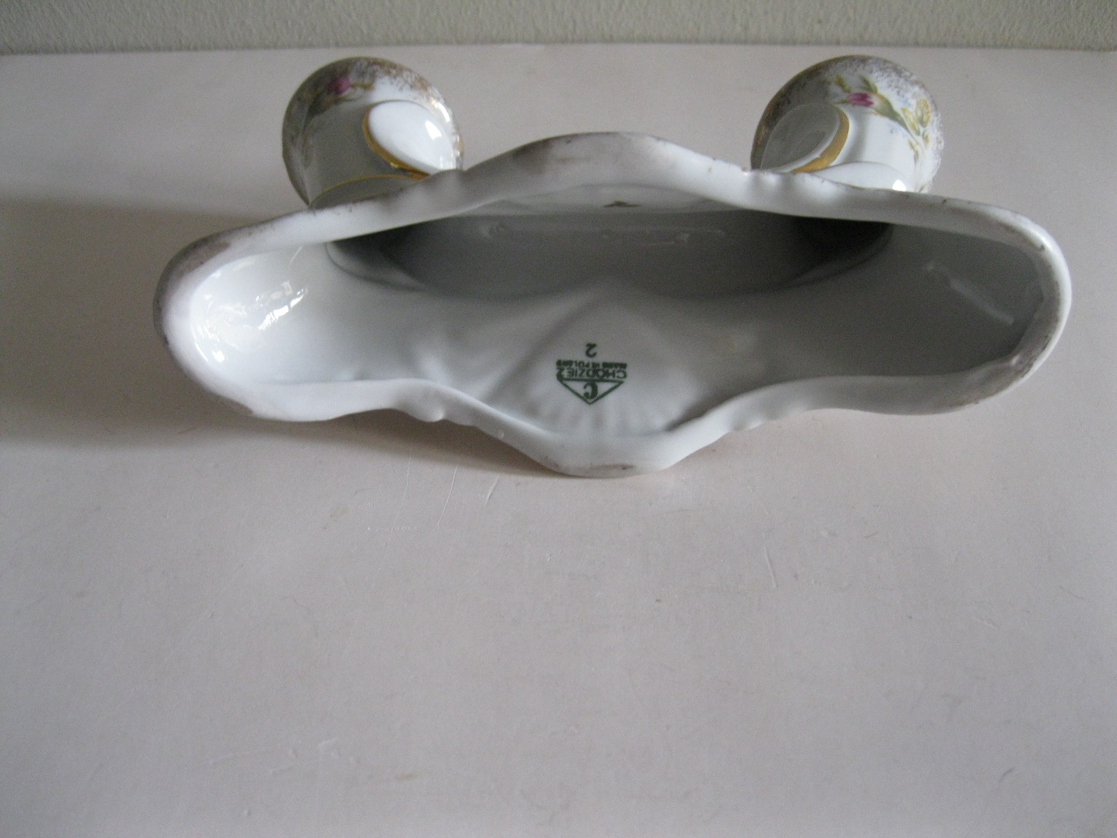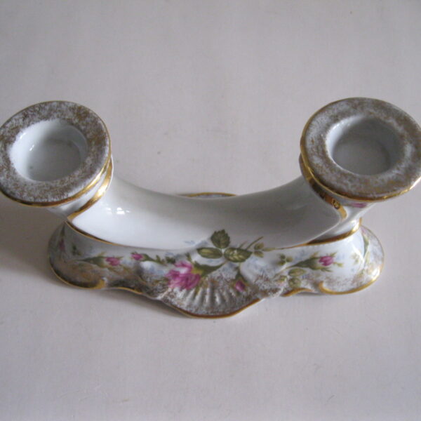 Oryginalny, stary, porcelanowy świecznik Iwona Chodzież z lat 60 – 70 tych. Wykonany z delikatnej porcelany w białym kolorze, zdobiony subtelnym reliefowym tłoczeniem, malowany wzorem w różowe róże i wykończony suto złoceniem. Zachowany w stanie bardzo dobrym, cały bez uszkodzeń. Piękna stara ozdoba wnętrza. Sygnowany starą sygnaturą fabryki od wewnątrz na dnie i numerowany. Polecam !